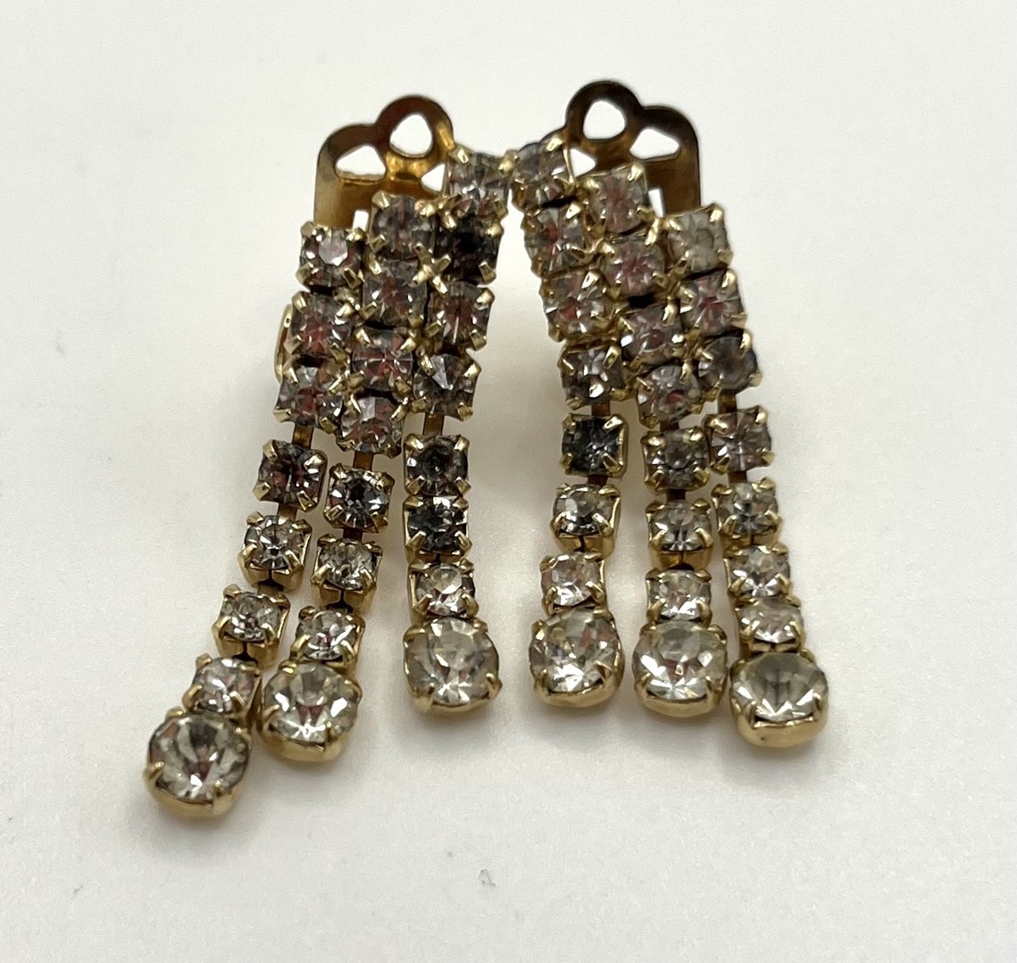 Paar Ohrclips, Modeschmuck, mit jeweils 21 Strasssteinen, teilweise farbig. Stilvoll gefertigt.