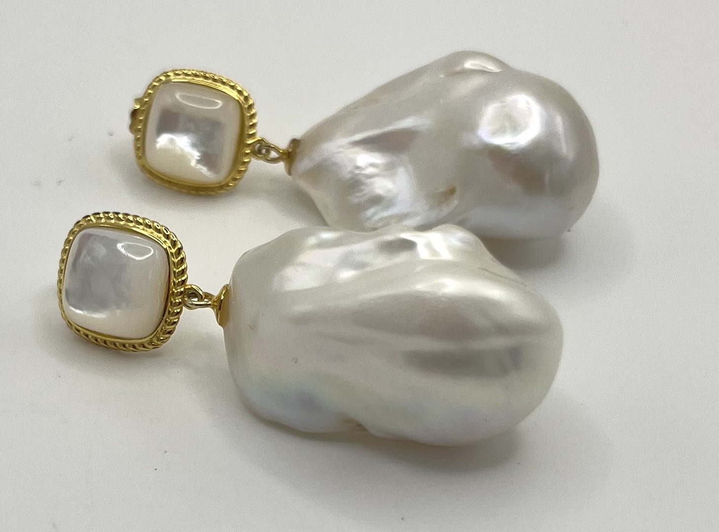 Paar Perlohrhänger, je eine große weiße Barockperle, 925 Sterlingsilber, vergoldet.