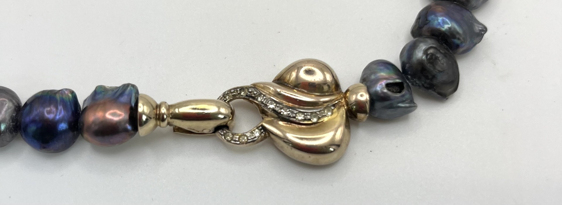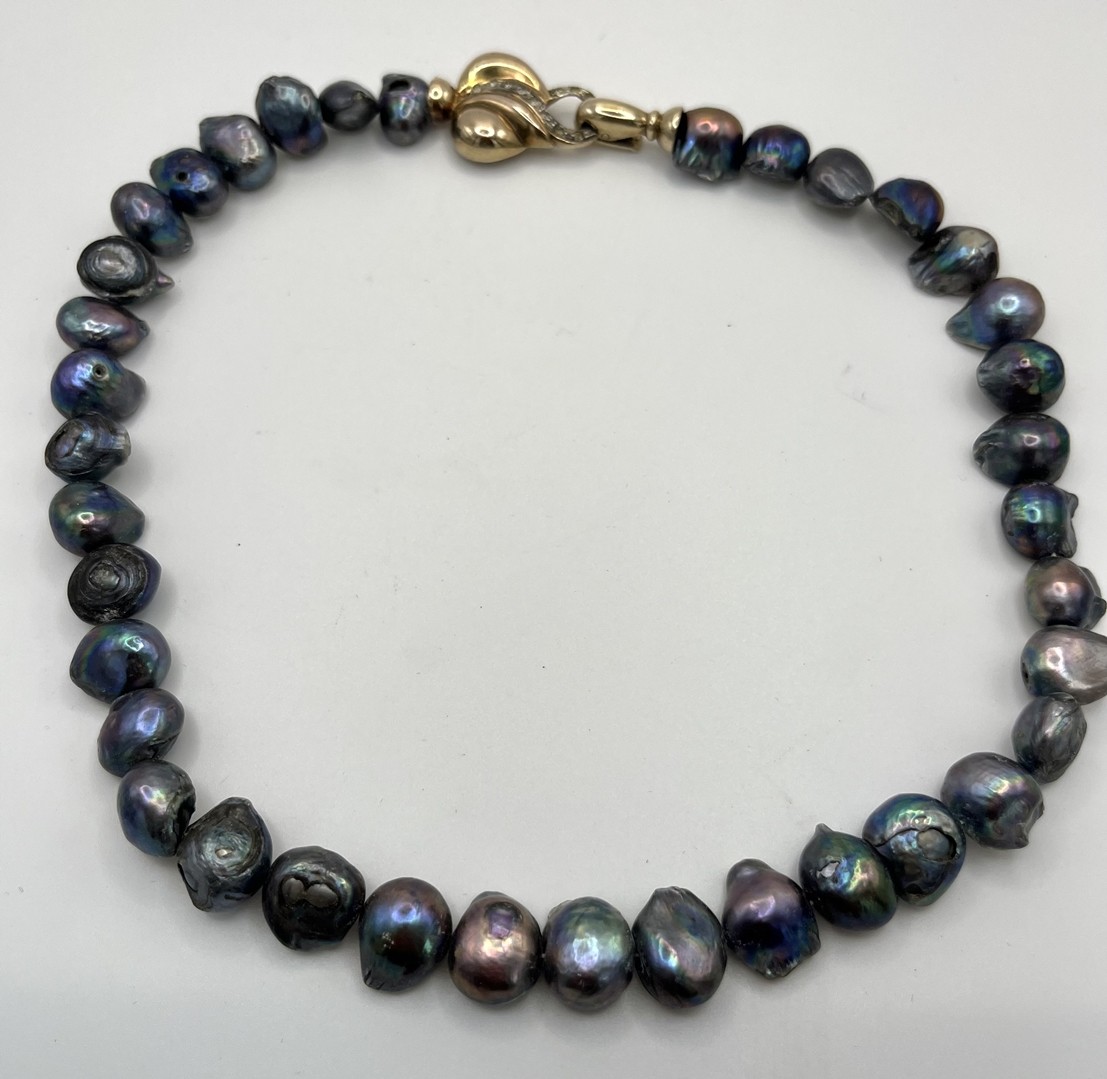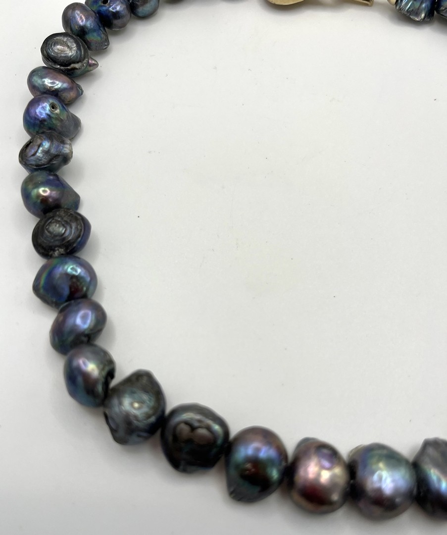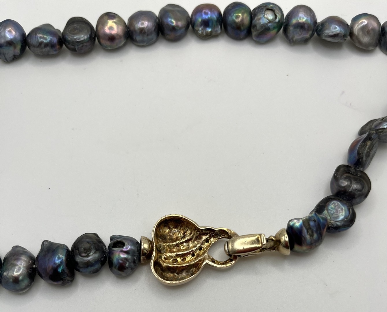 Los 257 - Perlenkette, graue Süßwasserperlen, 925 Sterlingsilber. Aufgezogene "schwarze Pfauen", vergoldeter Verschluss in geschwungenem Design.