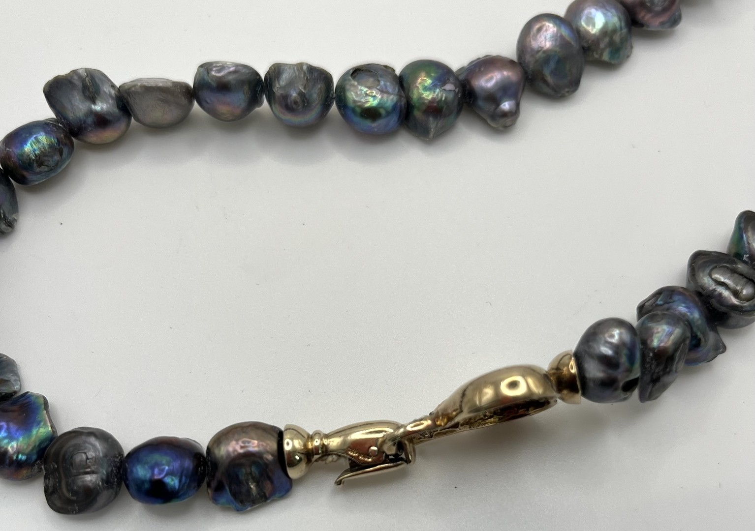 Perlenkette, graue Süßwasserperlen, 925 Sterlingsilber. Aufgezogene "schwarze Pfauen", vergoldeter Verschluss in geschwungenem Design.