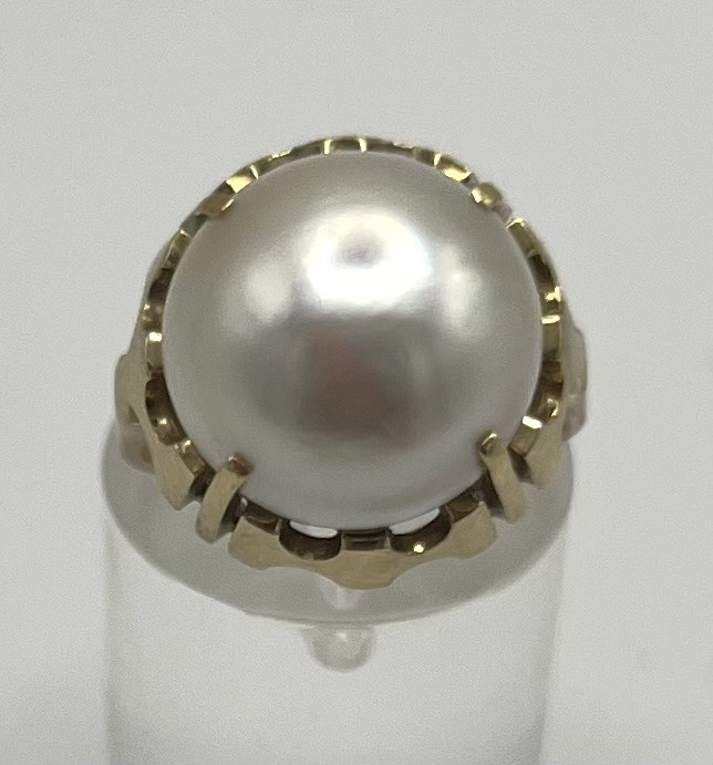 Los 254 - Perlenring, 585 Gelbgold, Größe 52. Große Perle in Gold gefasst.