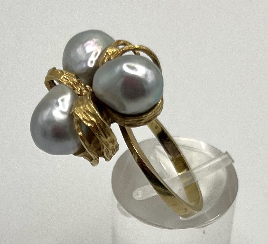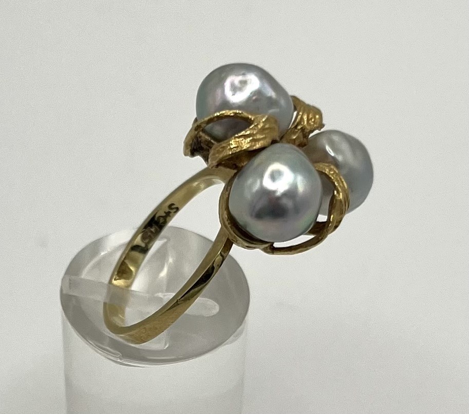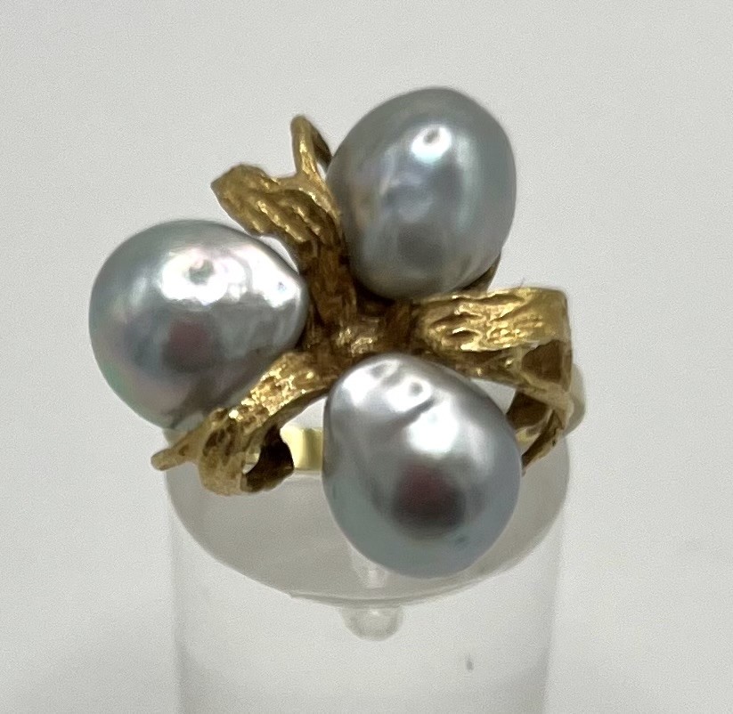 Los 273 - Perlenring, 585 Gelbgold, Größe 55. Schön geschwungener Ring mit drei aufgesetzten Perlen in einer Goldfassung.