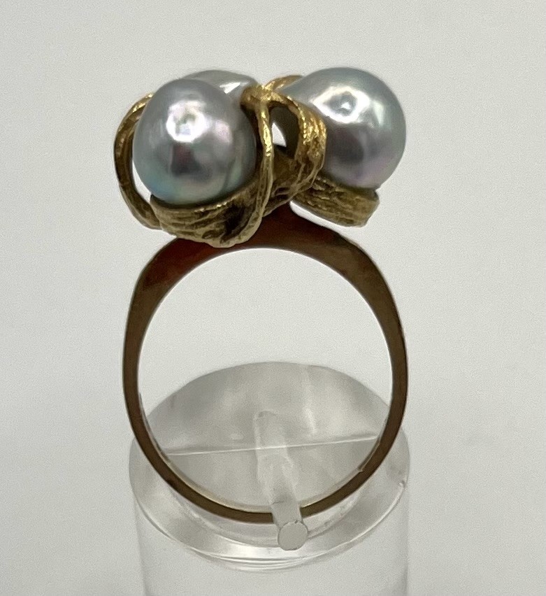 Perlenring, 585 Gelbgold, Größe 55. Schön geschwungener Ring mit drei aufgesetzten Perlen in einer Goldfassung.