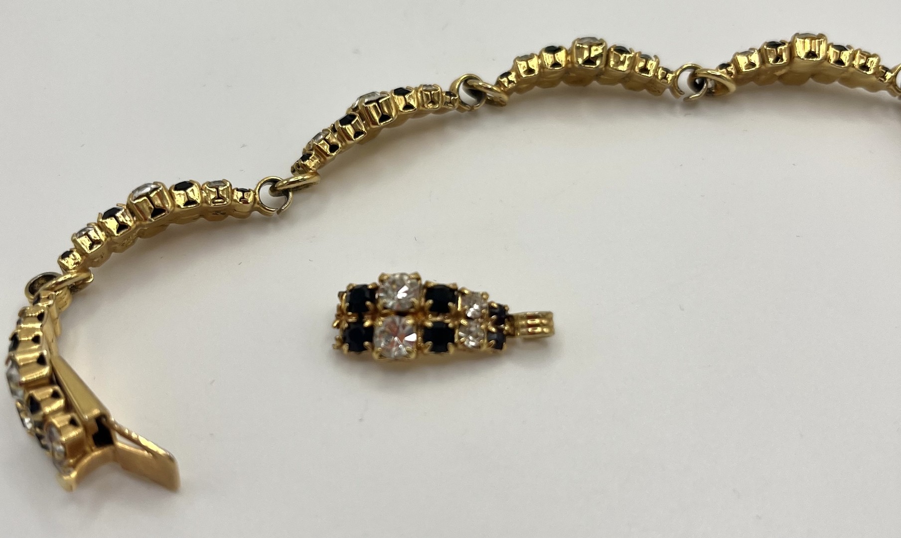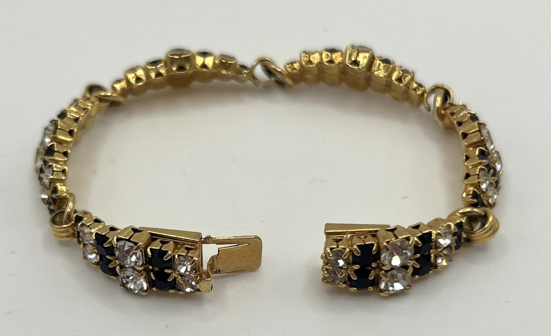Prunkvolles Armband, vergoldet, mit Zirkonia und roten Glassteinen. Sechs Glieder leicht gebogen mit Steckschließe, reichlich besetzt mit Zirkonia und roten Glassteinen.