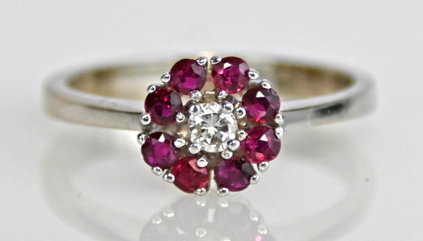 RING mit einem Brillanten umgeben von acht kleinen Rubinen, Weißgoldfassung 18ct, 2,82g, Gr. 50