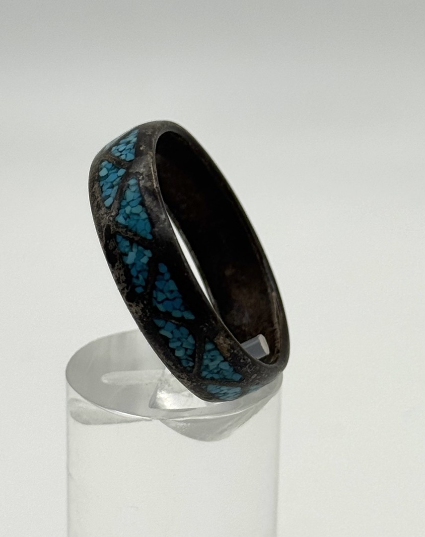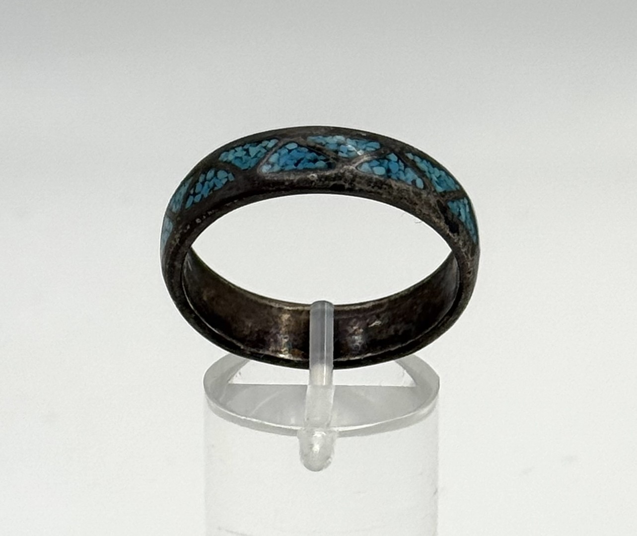 In die äußere Fassung des Ringes sind türkisfarbene Steine in dreieckiger Form eingearbeitet.