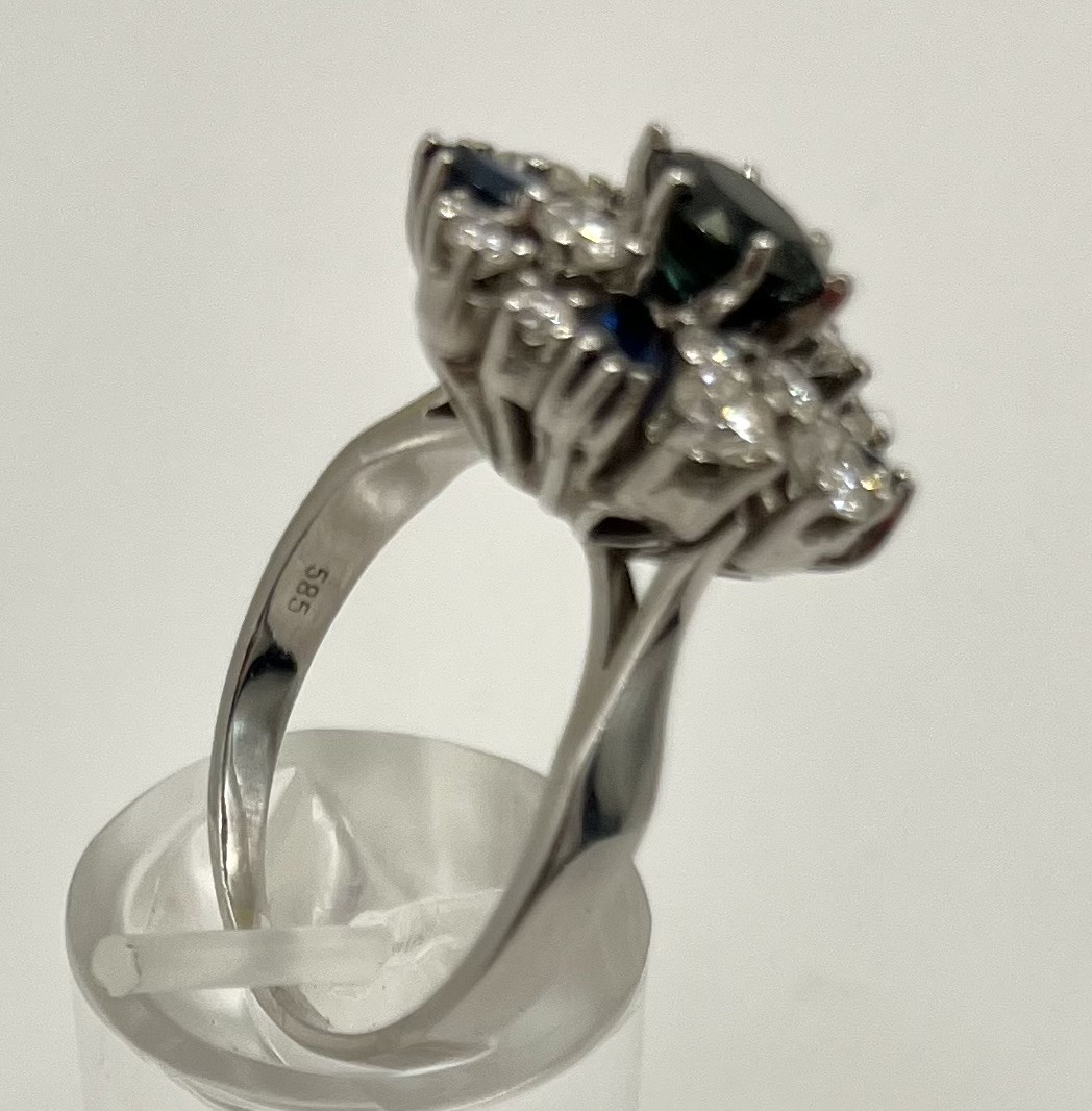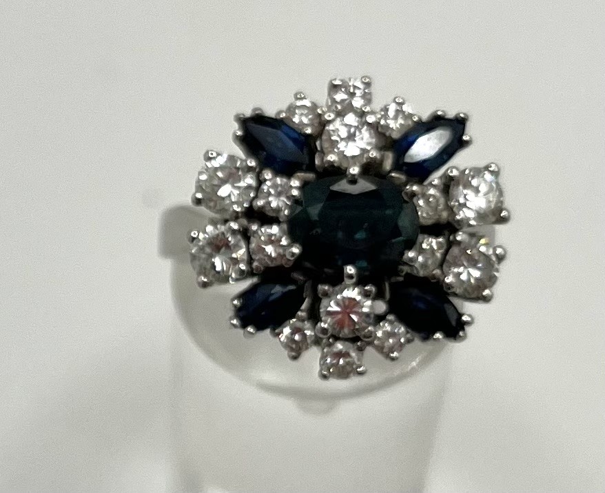 Los 272 - Ring mit Saphir und Brillanten, 585 Weißgold, Brillanten um 0,1ct und kleiner, Größe 59. Goldring in Blütenform stilisiert.