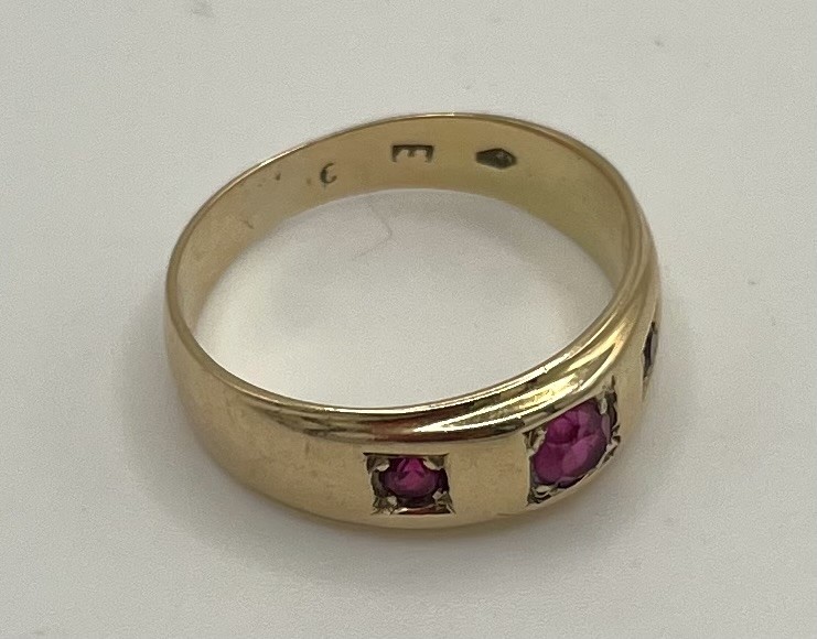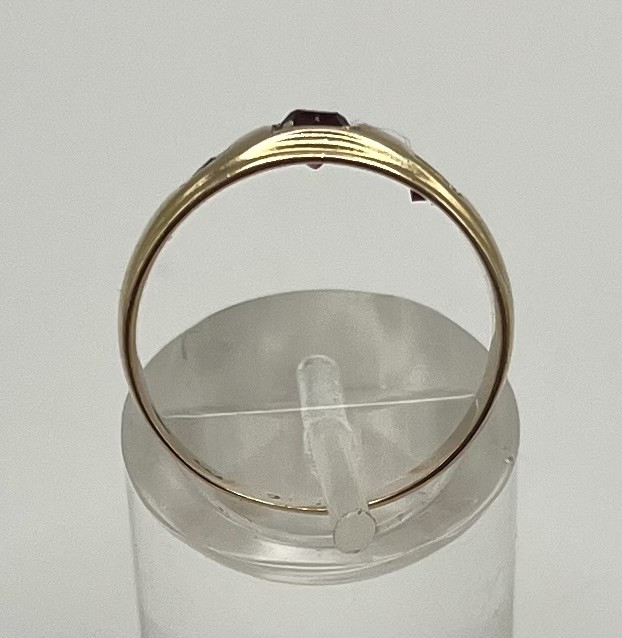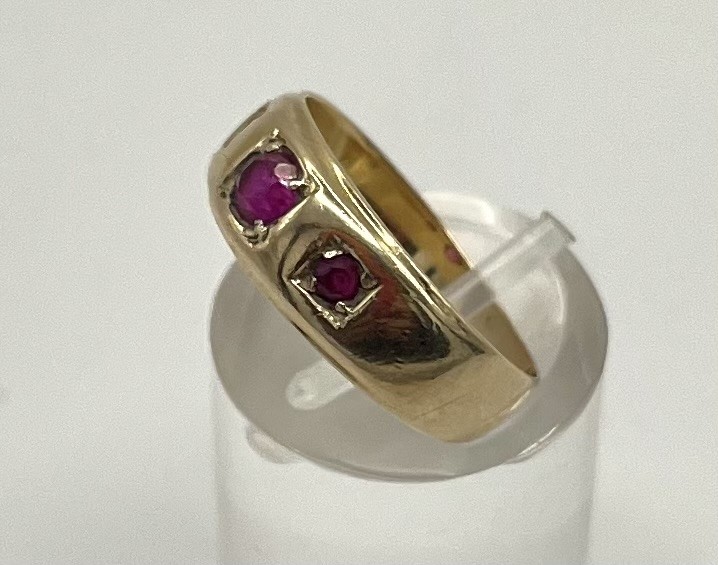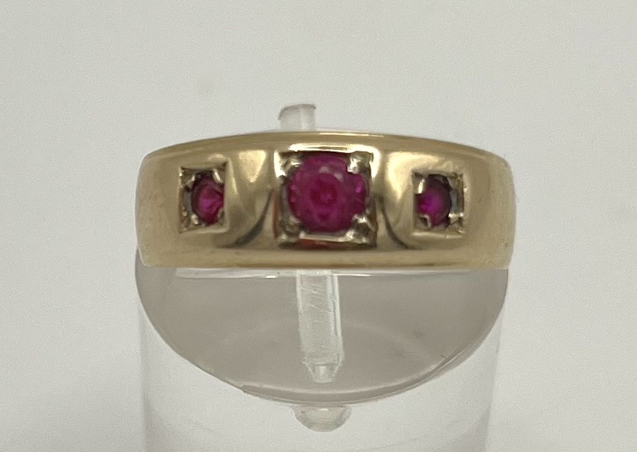 Los 277 - Rubinring, 585 Gelbgold, Größe 52. Fein gearbeiteter Ring mit mittig eingesetztem Rubin, der von zwei weiteren flankiert wird.