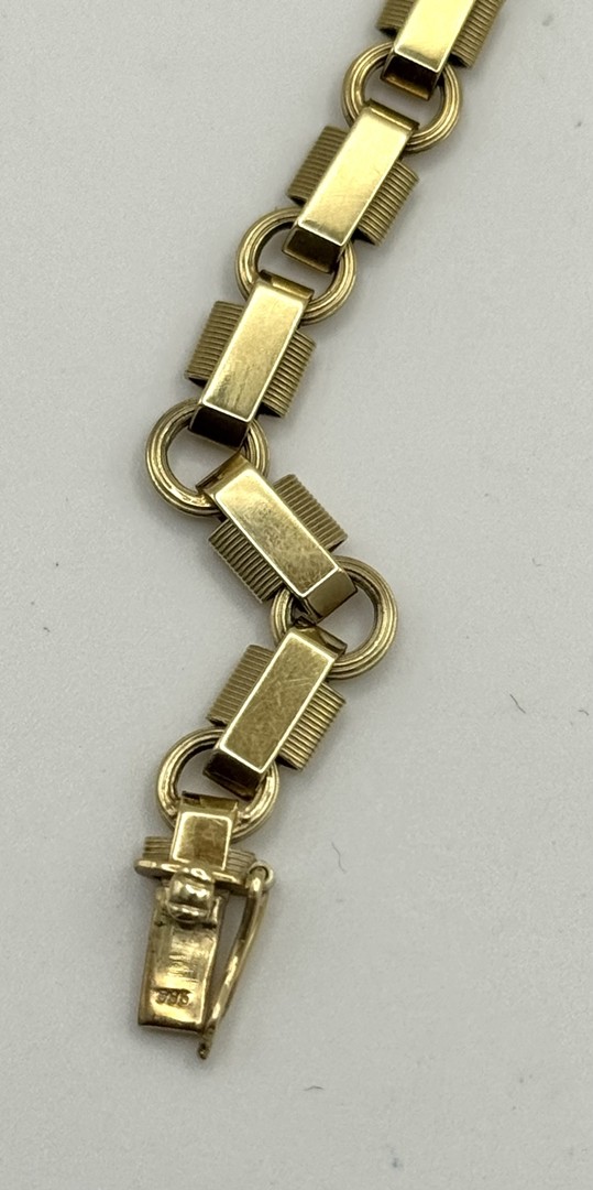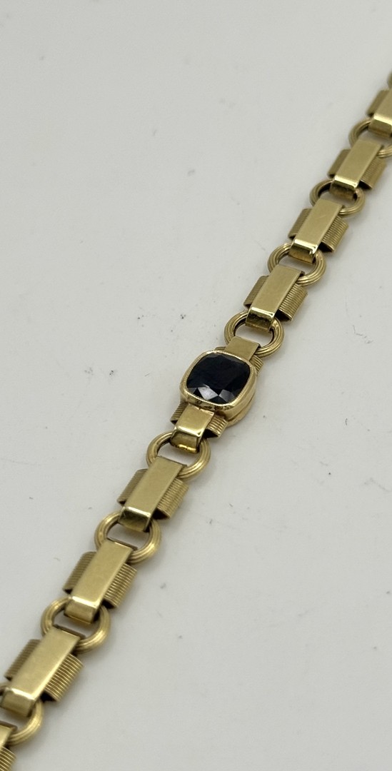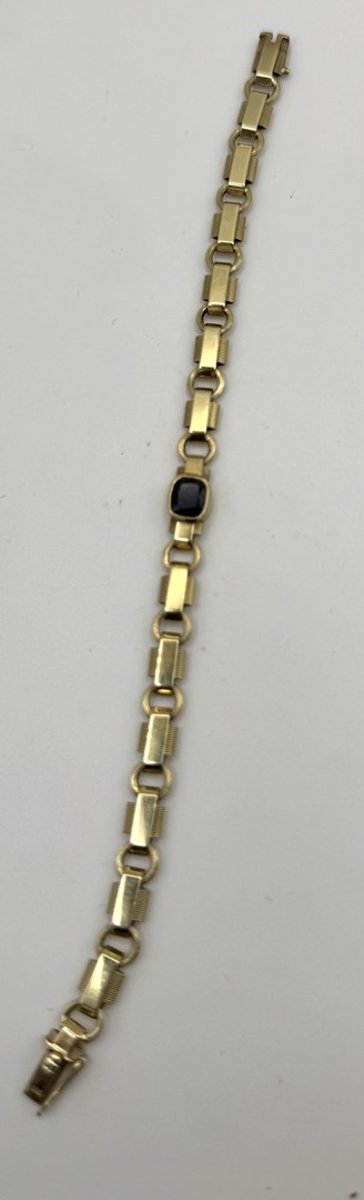 Los 176 - Saphir Armband, 585 Gelbgold, gegliedert. Gegliedertes Armband mit mittig gefasstem, rechteckigen Saphir. Steckverschluss mit Sicherheitsacht. Länge 18 cm, Gewicht 9,35g.