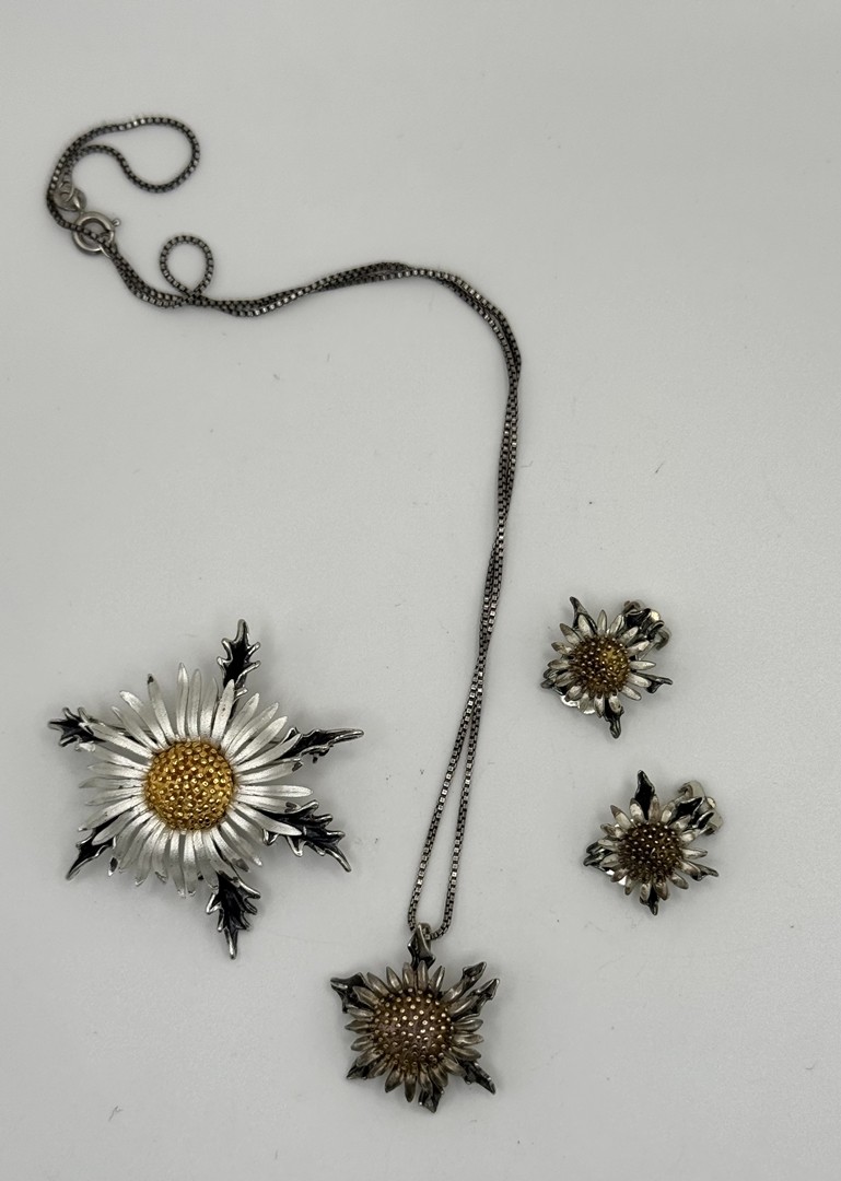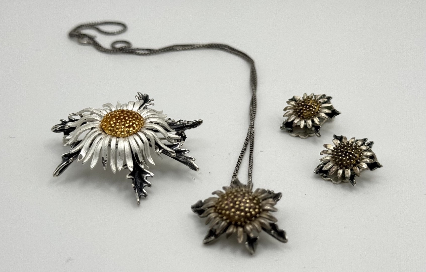 Los 239 - Schmuck-Set "Silberdisteln", paar Ohrclips, Anhänger und Brosche, 835 Silber, Kette 925 Sterlingsilber. Fein gearbeitetes Set mit schön gearbeiteten Silberdisteln.