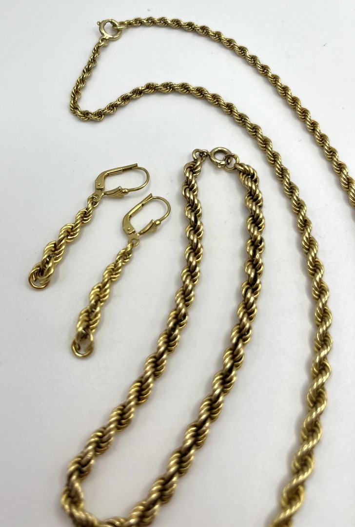 Schmuckkonvolut, drei-teilig, 585 Gelbgold, bestehend aus Halskette, Armband und paar Ohrhänger. Im zeitlosen Kordeldesign.