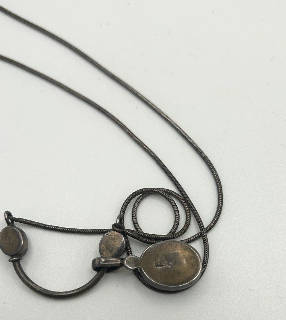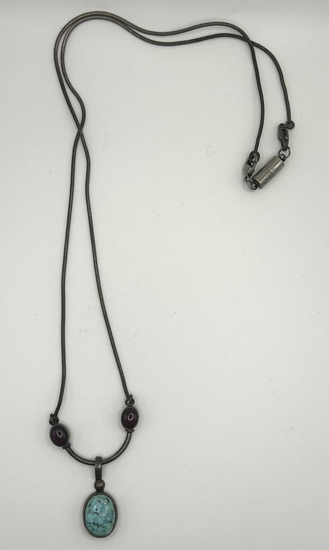 Los 154 - Silberanhänger an Kette, Anhänger 925 Sterlingsilber. Anhänger trägt zwei Granatsteine und einen Türkis, mit Magnetverschluss. 8,4g ohne Kette.