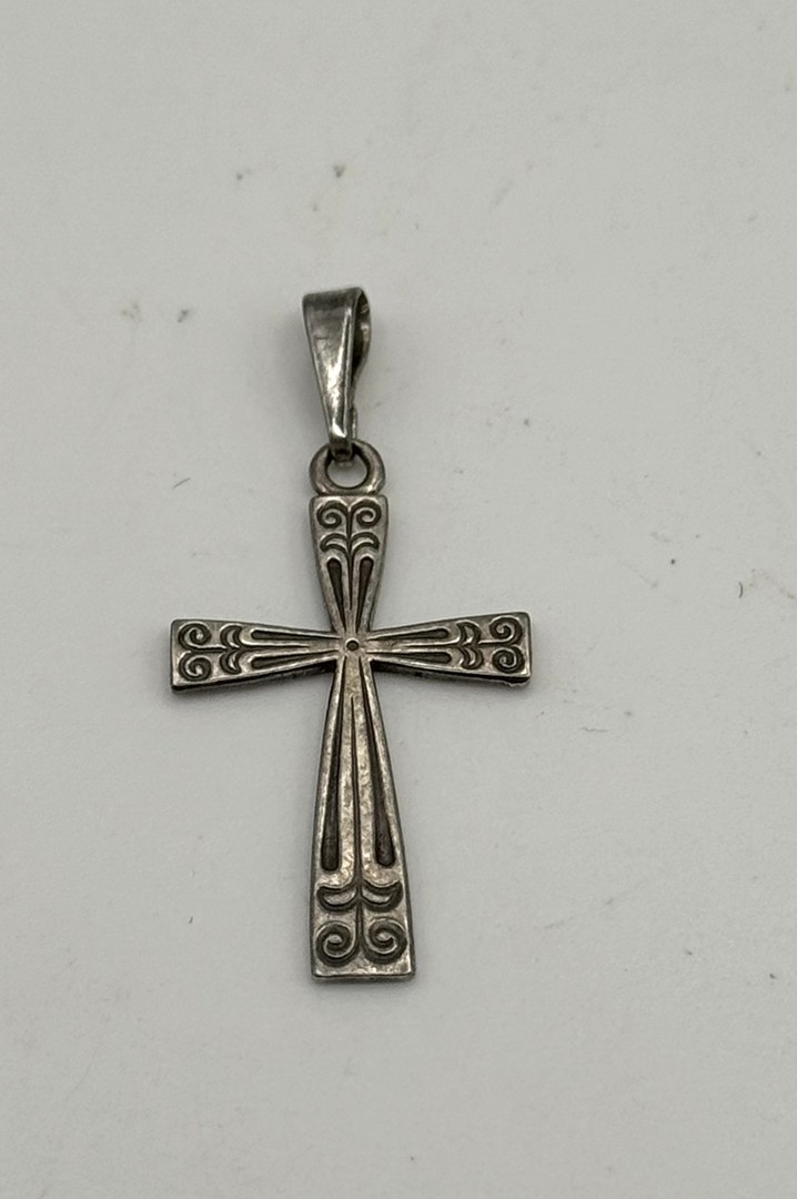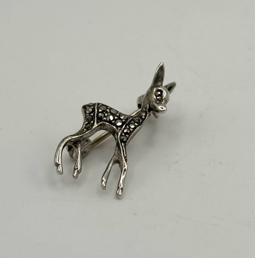Los 235 - Silberkonvolut, 835/925 Silber, bestehend aus drei Ringen, zwei Broschen und einem Anhänger. 835 Silber: Ein Ring, Größe 52, eine Brosche in Rehform und einem Anhänger in Kreuzform. 5,53g.