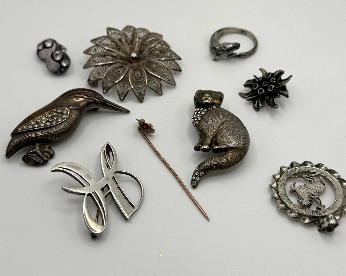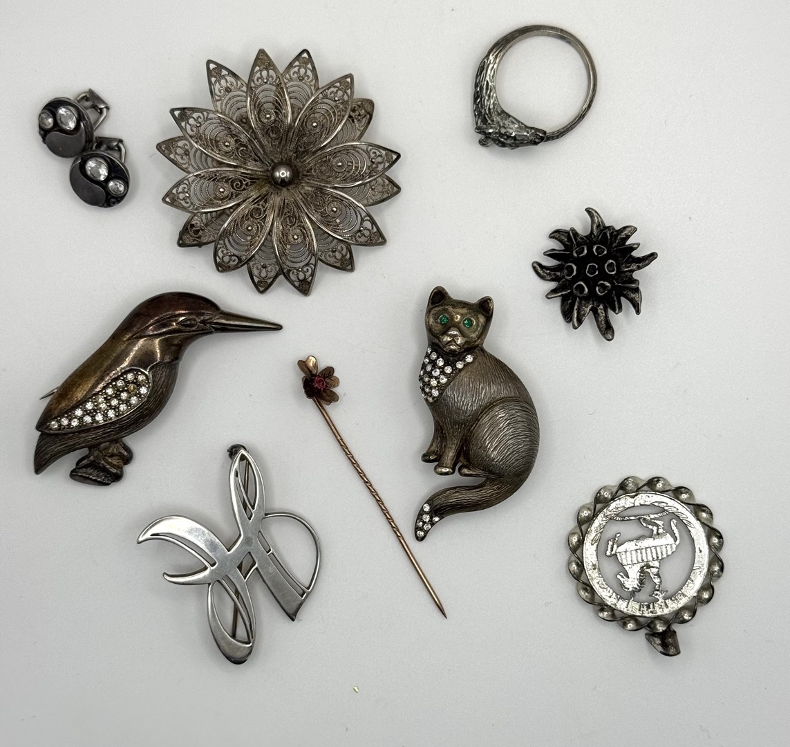 Silberkonvolut, 835/925 Sterlingsilber. Zwei Ohrstecker, vier Broschen und ein Anhänger. Sowie ein Ring, ein Anhänger und eine Nadel ohne Punzierung.