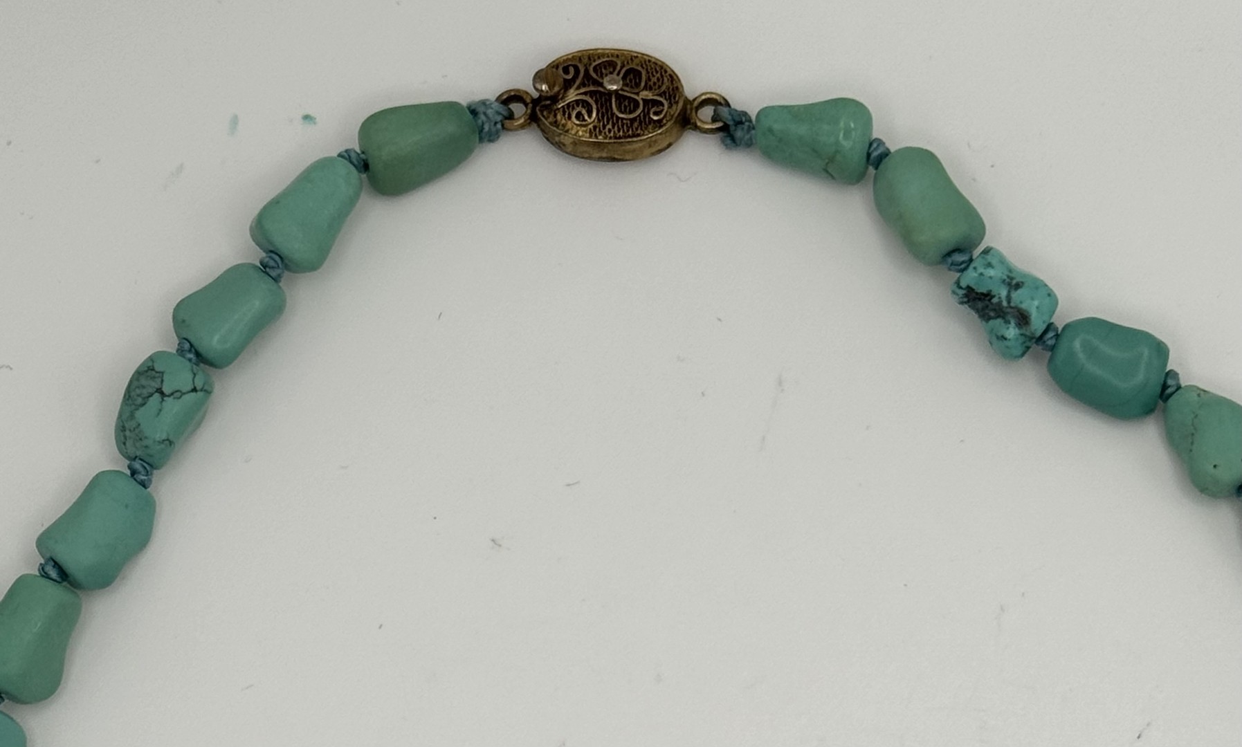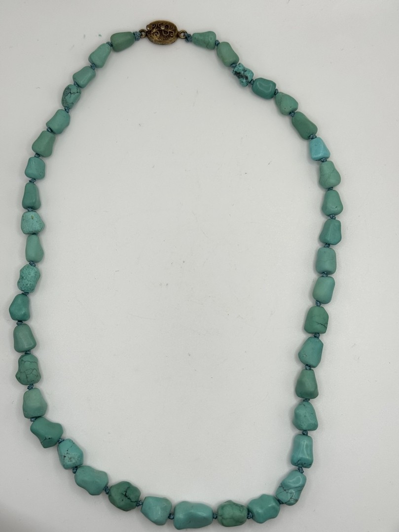Türkis Kette, einzeln geknotet. Steckverschluss. Länge 24 cm.