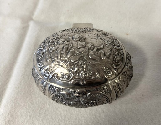 Vier musizierende Engel verzieren den Deckel der Silberdose und diese werden eingerahmt durch Ornamente. Diese Ornamente werden weitergeführt am Bauch der ovalen Dose und ziehen sich runter bis zu den vier Füßen.