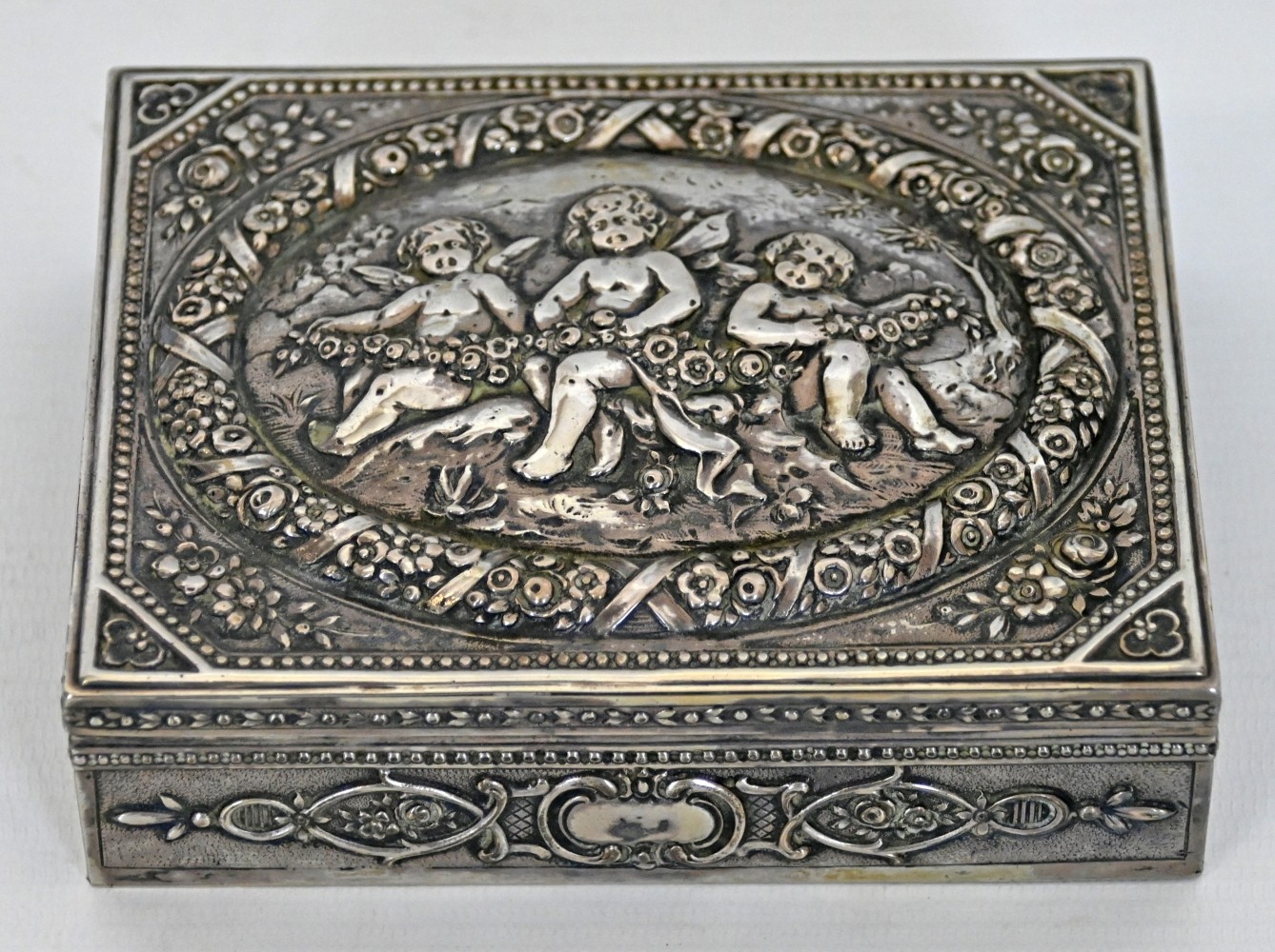 FLACHE DECKELDOSE rechteckig, Deckel mit reliefierter Dekoration, Silber 800, punziert: Halbmond und Krone, 309g, 13,4x10,5x3,9cm