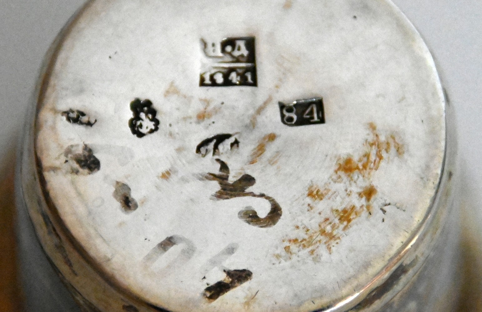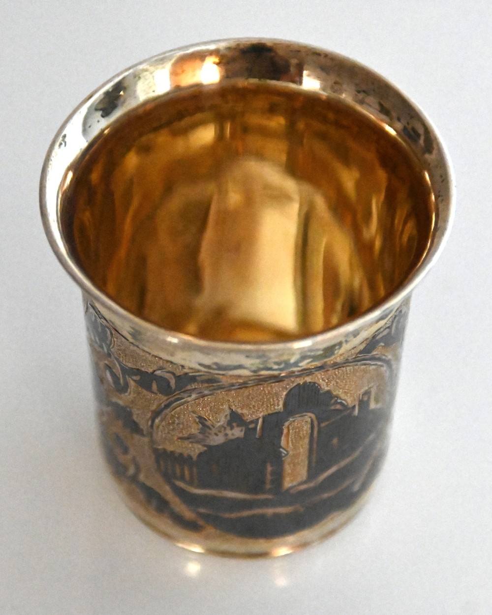 RUSSISCHER BECHER zylindrische Form mit ausgestelltem Rand, teilgeschwärzter, ziselierter Landschafts- und Blumendekor auf Wandung, Silber 84 Zolotniki, 19. Jahrhundert, Meistermarke, H 4,5cm, D 4cm, 40g
