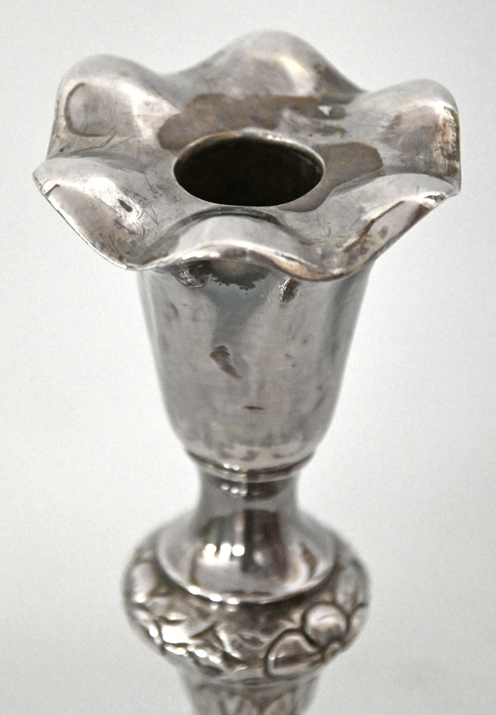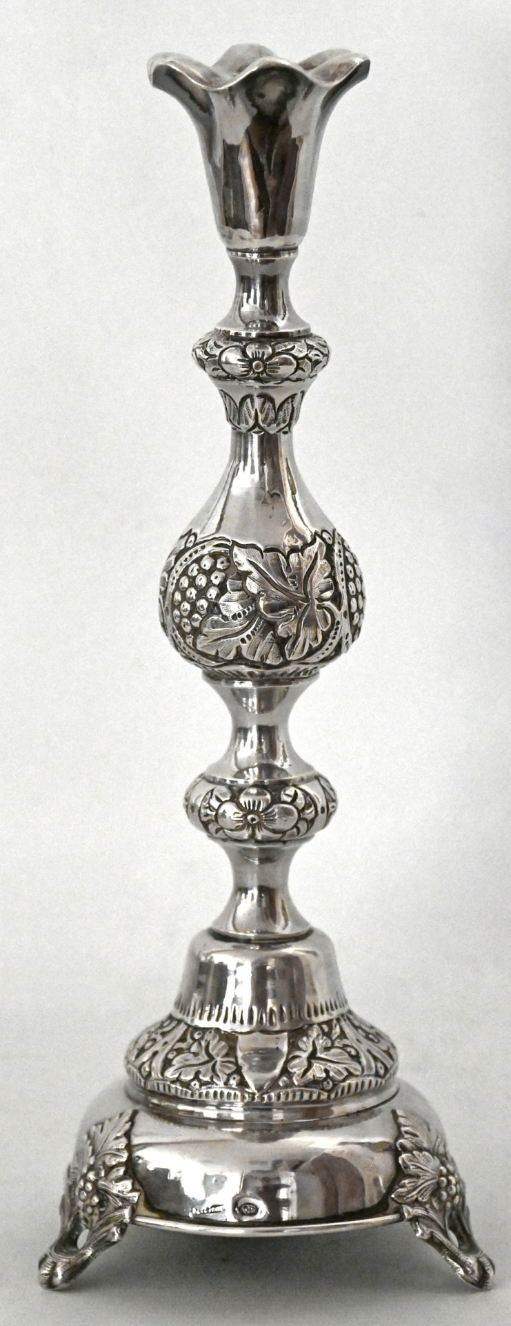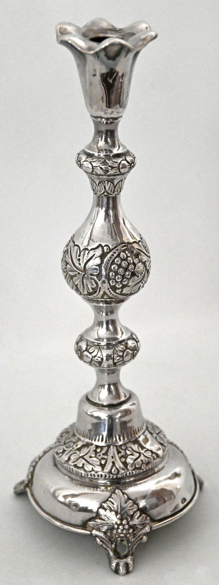 SABBAT-LEUCHTER mit Nodusschaft, dekoriert mit Weintrauben und Blüten, kelchförmige Kerzenhalter, auf gebogtem Stand mit drei Füßen, Silber, gestempelt, H 34cm, 374g