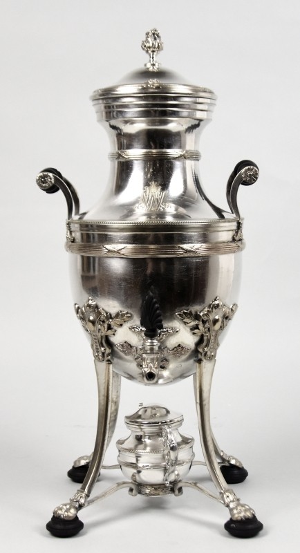 SAMOVAR auf hohen schlanken Beinen mit Tatzenfüßen und Blattrelief am Ansatz des schlichten ovoiden Korpus, Mitte unten Auslasshahn, Schulter mit Tragegriffen aus dunklem Holz (einer beschädigt), konkav gekehlter Hals, Ziermonogramm auf der Wandung, mit umlaufendem Perlrand- und Banddekor, hoher gewölbter Deckel mit Zapfenknauf, Stövchen mit reliefierten Löwenhenkeln, Kupfer versilbert, 1611g, H 38cm, B 17,5cm, ein Fuß nicht Original