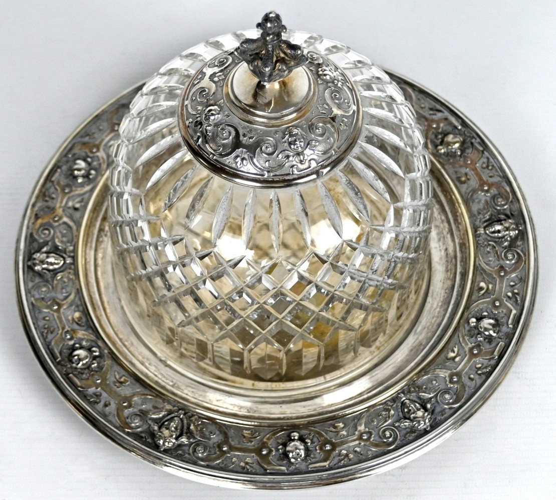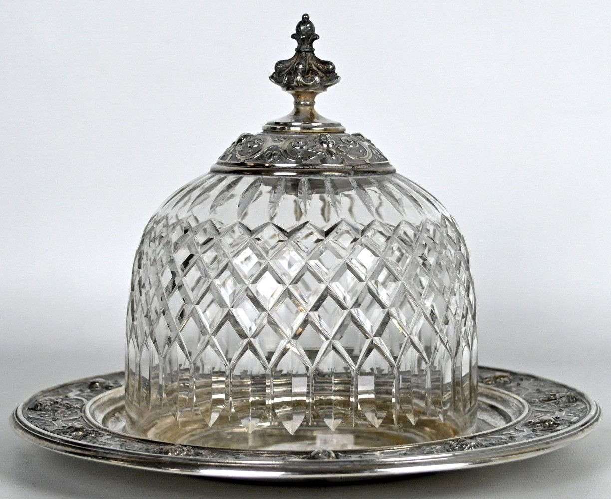SCHALE rund, mit Glasglocke, figürlicher Reliefrand, Silber 800, punziert, 244g (Schale), D 24cm, H 2cm (Schale) und 18,5cm (mit Glocke)