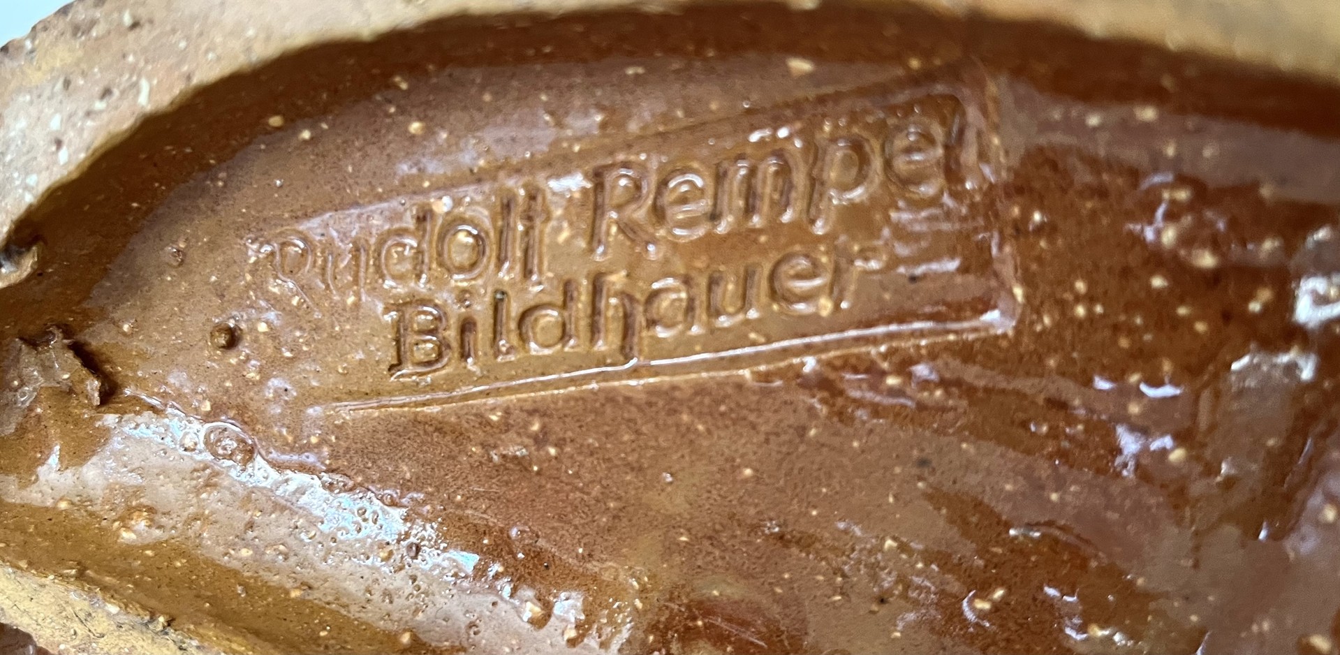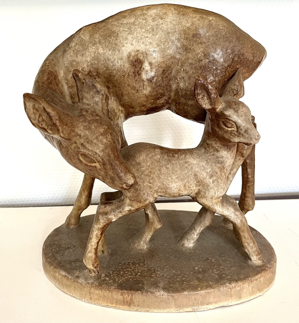 Rempel, Rudolf (1892-1970) Ricke mit Kitz, Keramikskulptur. Hellrote Scherben mit brauner/weißlicher Laufglasur.