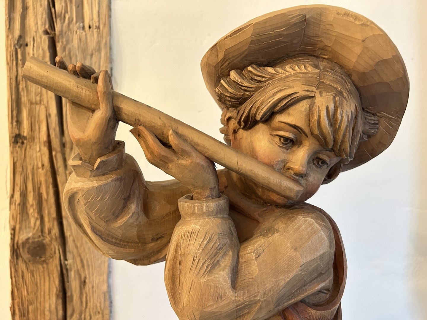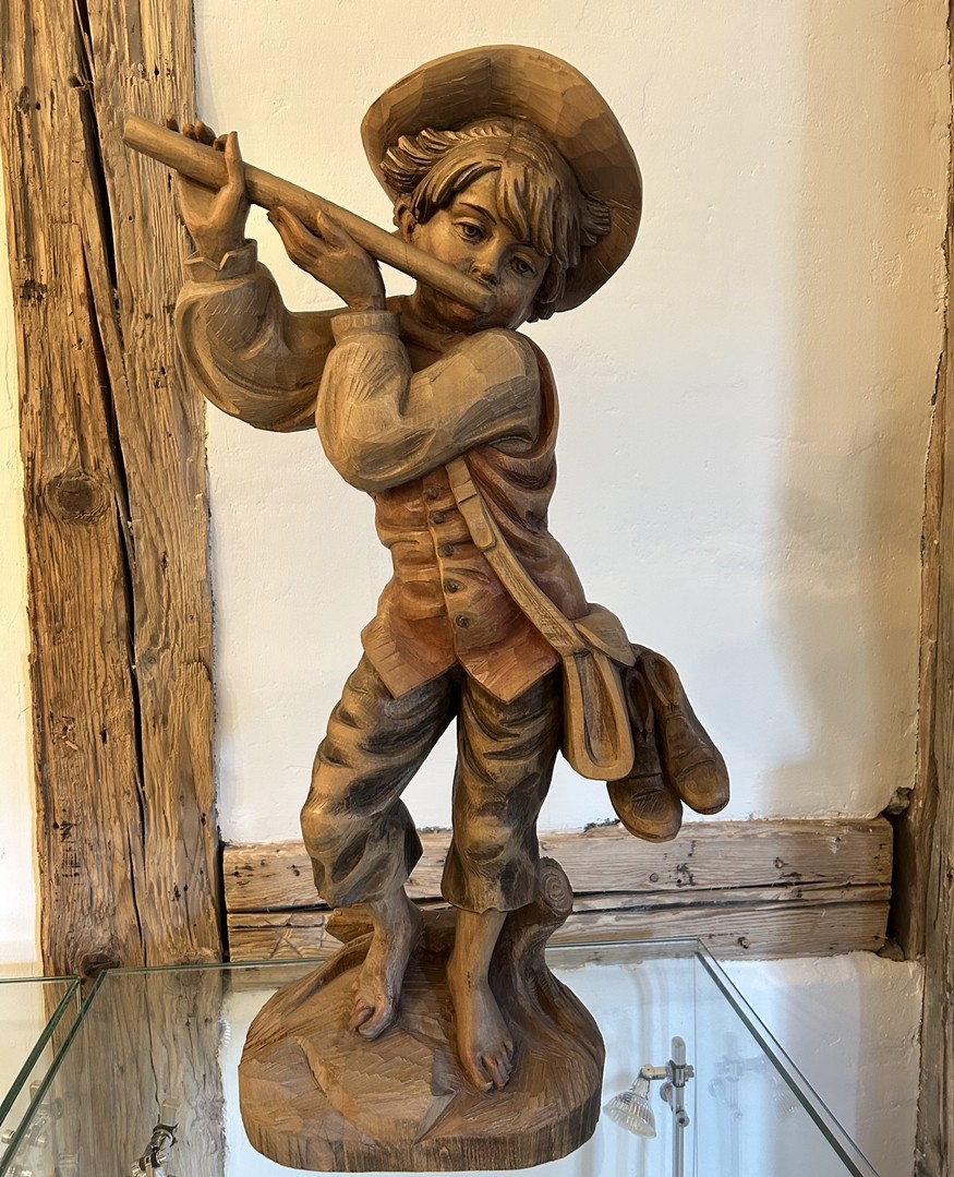 Die detailreiche Schnitzerei eines Jungen mit Flöte unterstreicht die kunstvolle Arbeit von Franz Senoner. Durch die farbige Lasur wird das kindliche Wesen des Jungen verstärkt.