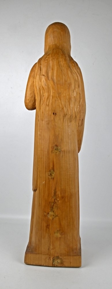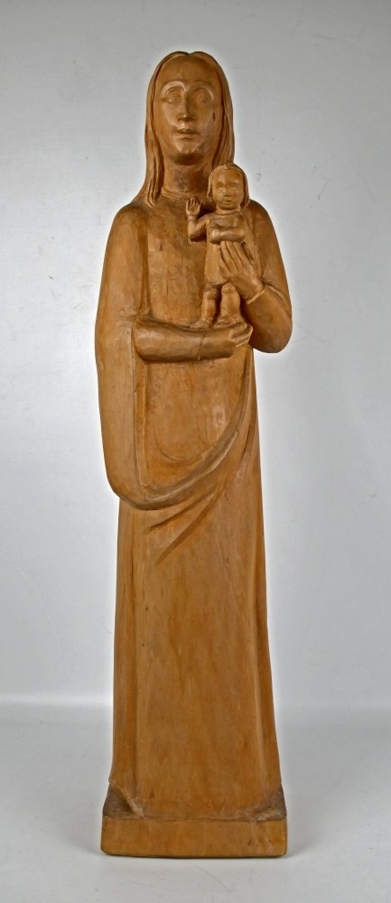 EISELE Carl (1884 Ravensburg- 1963 Stuttgart) ''Madonna mit Kind'', stehende Frau im Gewand, mit schulterlangem Haar, auf Vierecksockel, voll rund geschnitzte Holzfigur, L 76cm, Sockel 18x14cm *Eisele studierte an der Stuttgarter Akademie bei Ludwig Habich. Er ist bekannt für sakrale Plastiken, monumentale Plastiken von ihm stehen auch im öffentlichen Raum*