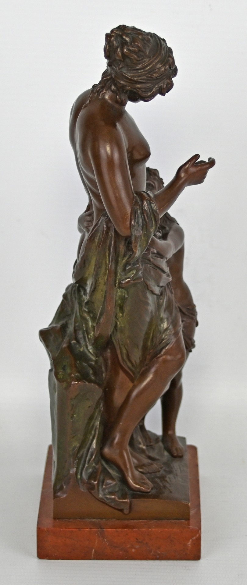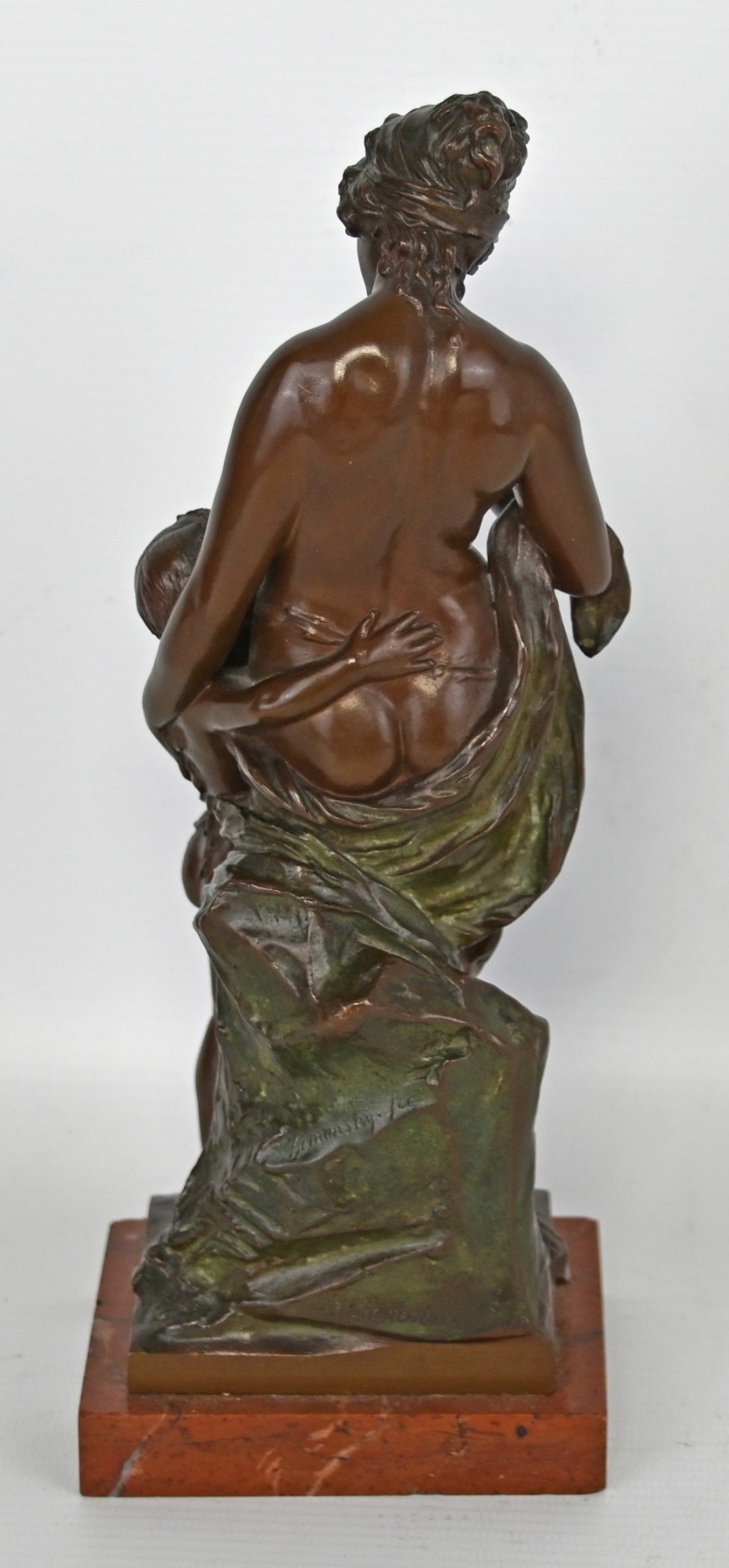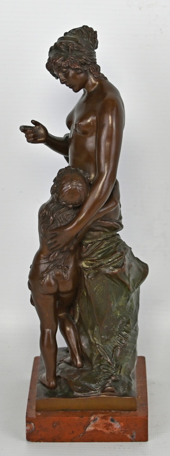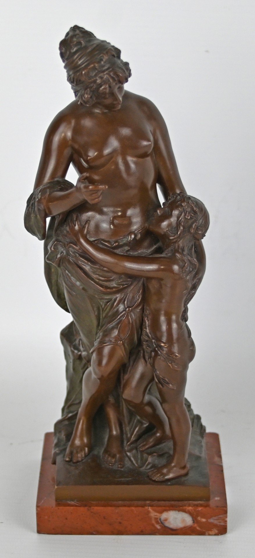 GLADENBECK Hermann [und Sohn] (1827 Berlin - 1918 Friedrichshagen) ''Stehender Frauenakt mit Kind'', Mädchen mit langem Haar und Blumenkranz wird von einer Frau liebevoll umarmt, diese leicht mit Tuch umhüllt, Bronze-Skulptur mit rechteckigem Sockel auf rechteckiger Marmorplinthe (minimal bestoßen), in der Bronze signiert ''H. Gladenbeck & Sohn'', H 25cm *Aus der Bronzegießerei Gladenbeck & Sohn gingen zahlreiche bedeutende Standbilder und Denkmale sowie Groß- und Kleinplastiken hervor.*