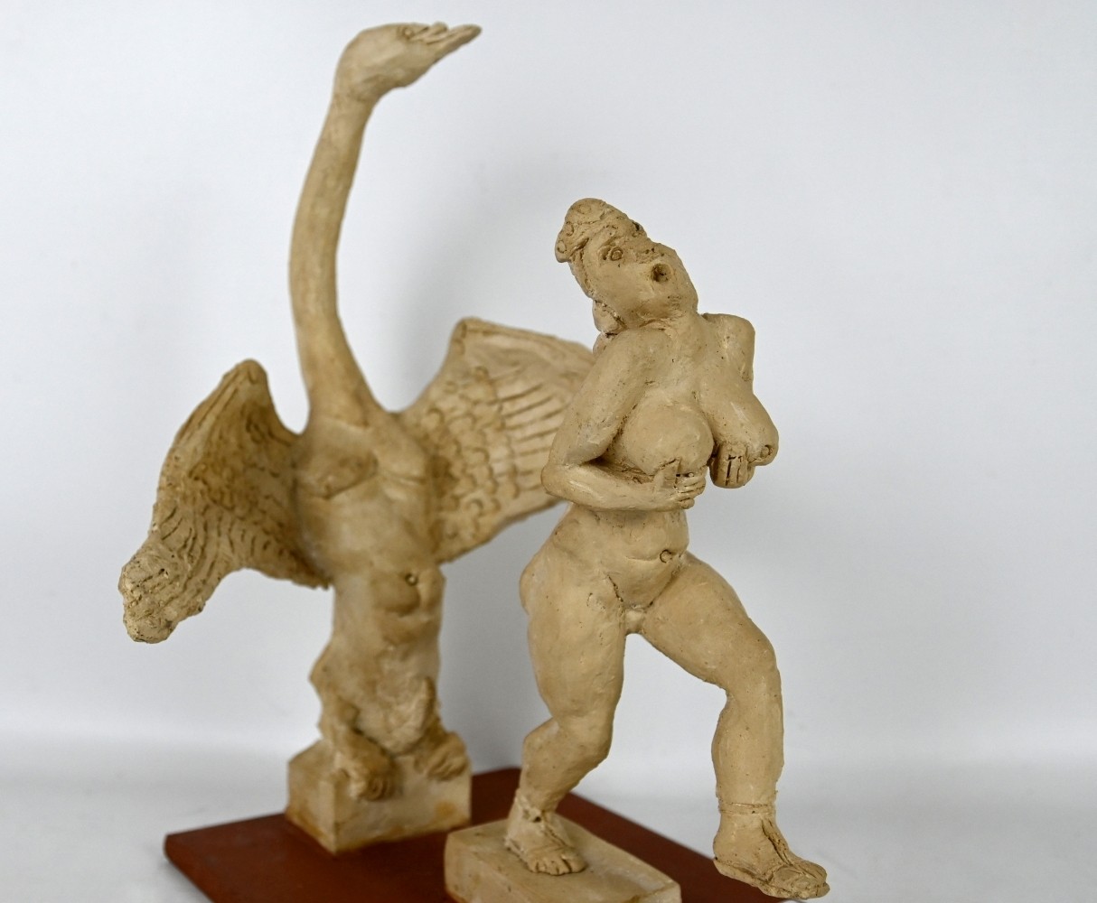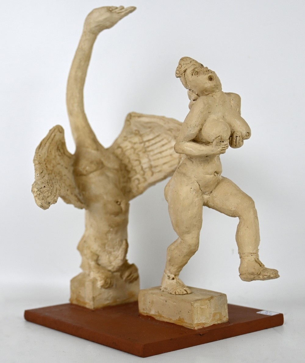 LENK Peter (1947 Nürnberg) ''Leda und der Schwan'' nackte Leda steht vor dem erregten Schwan, Skulpturen aus hellem Ton auf brauner Standplatte, H 32cm, B 20cm, T 19cm