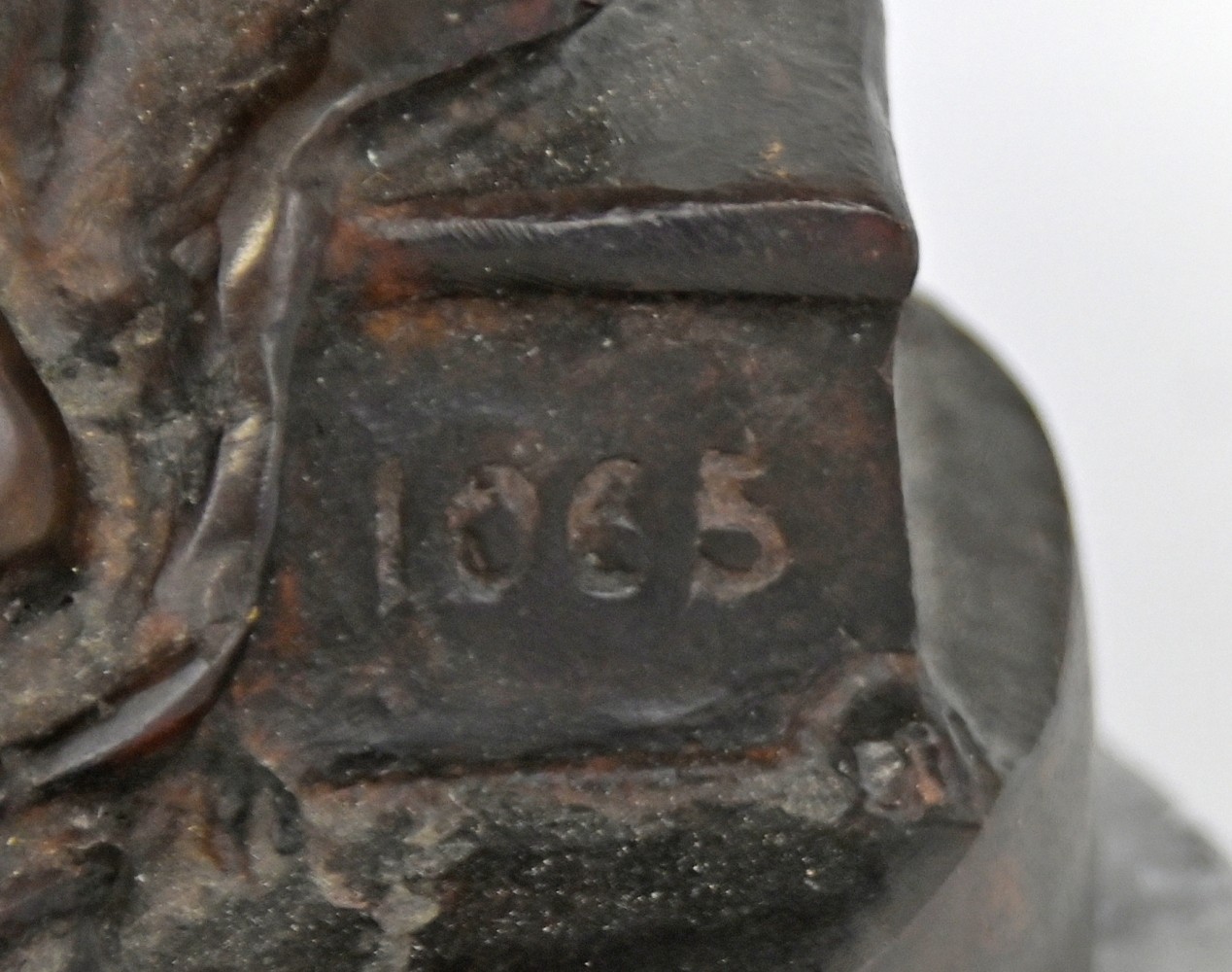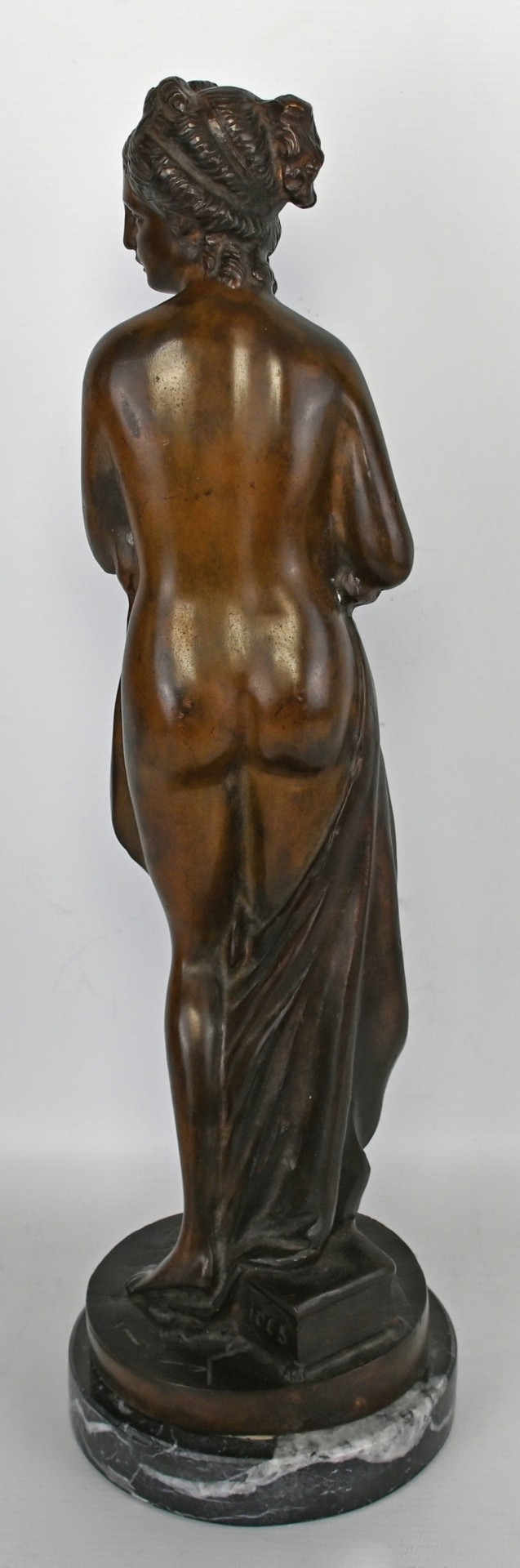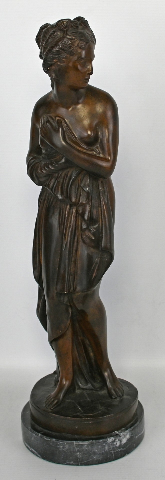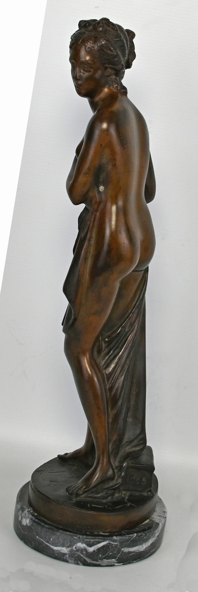 STEHENDER FRAUENAKT Blick nach links gewandt, Körper teilweise in Tuch gehüllt, Haare hochgesteckt, Bronze-Skulptur mit rundem Sockel auf runder Marmorplinthe (leicht bestoßen), nummeriert 1065, H 43cm