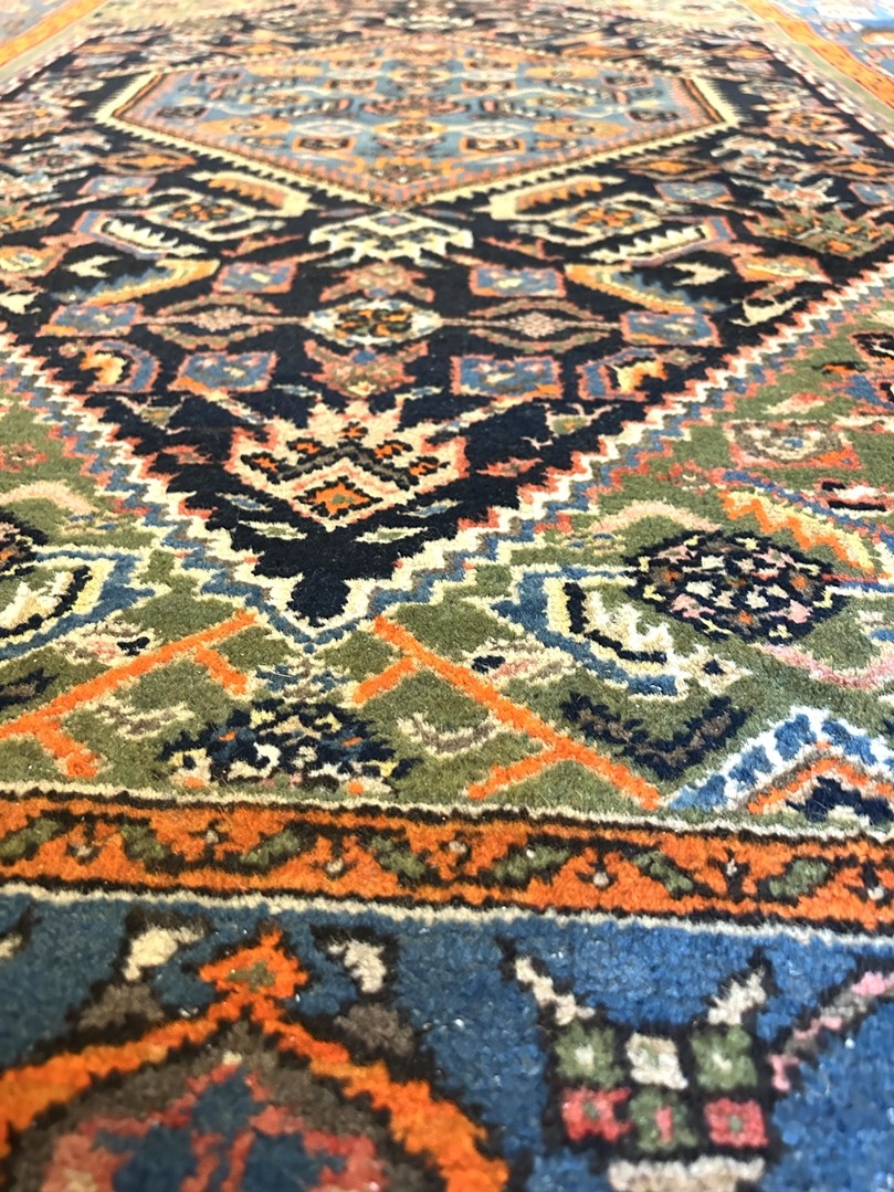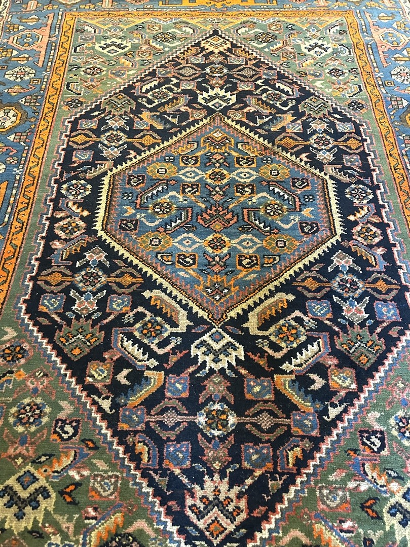 Das sechseckige Medaillon ist zentraler Bestandteil des Teppichs, der auf grünem Grund basiert. Die umliegenden Ornamente sind aus orangener und blauer Wolle gewebt.